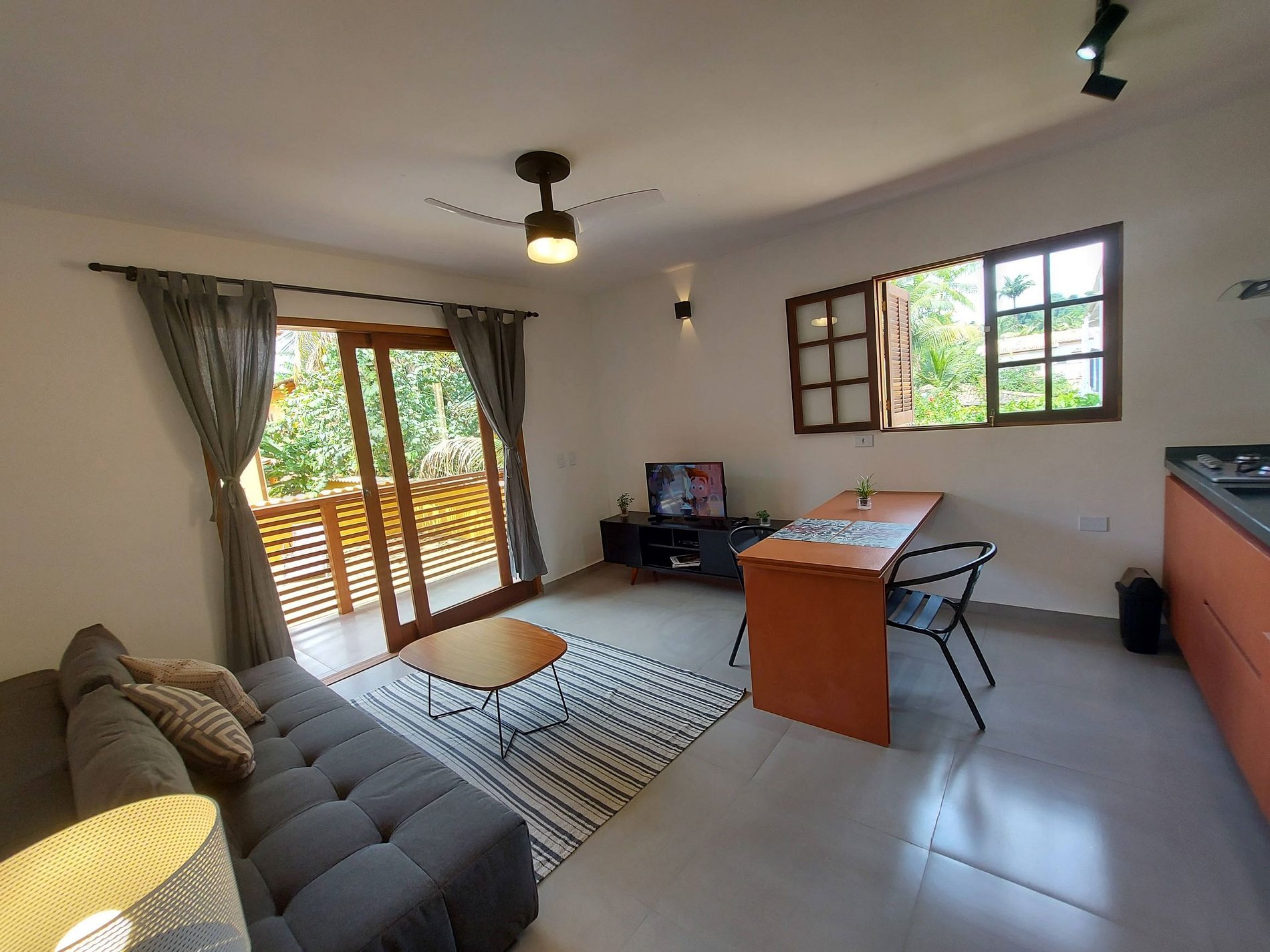 Na sala, um sofá cama super confortável. Smart TV com Tv a cabo e ventilador de teto