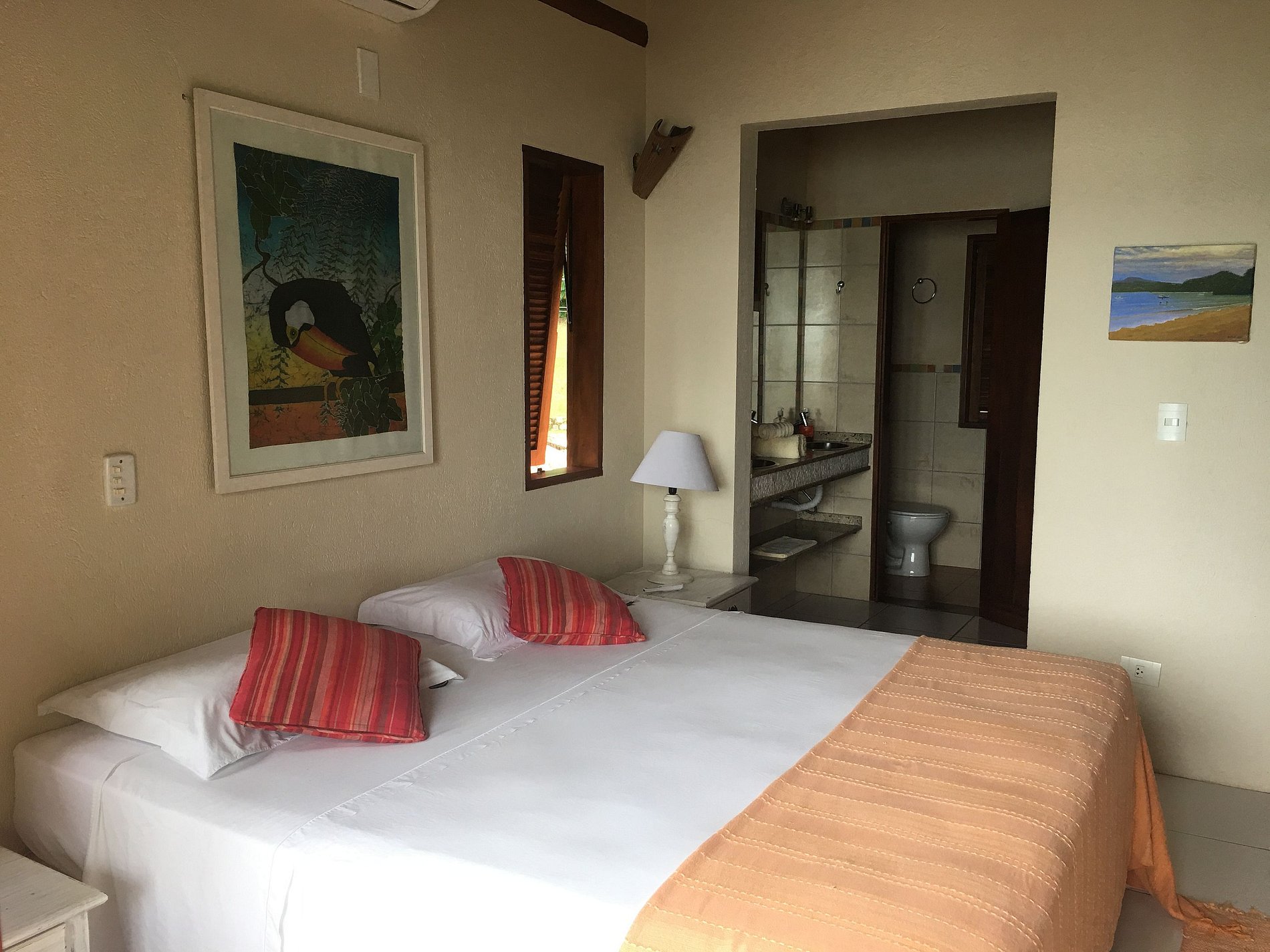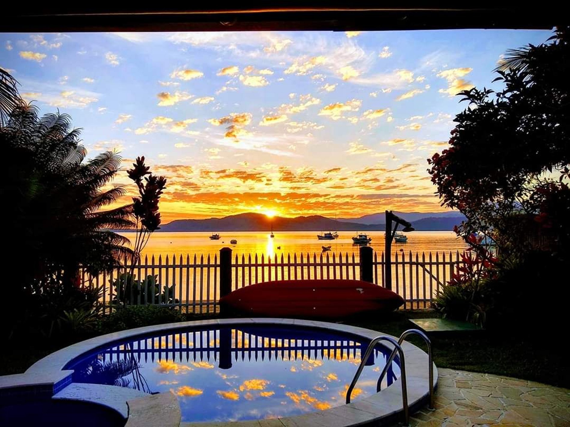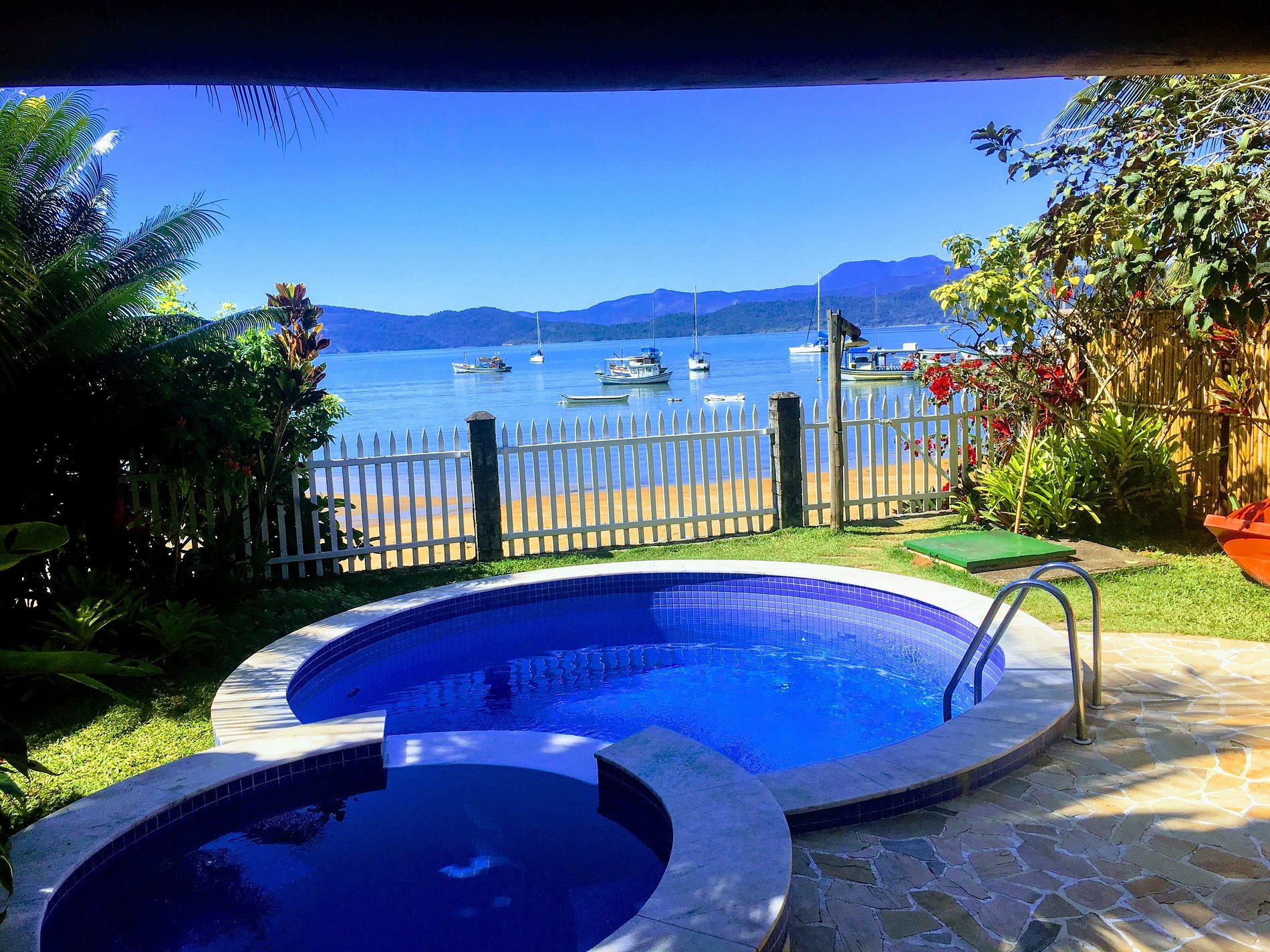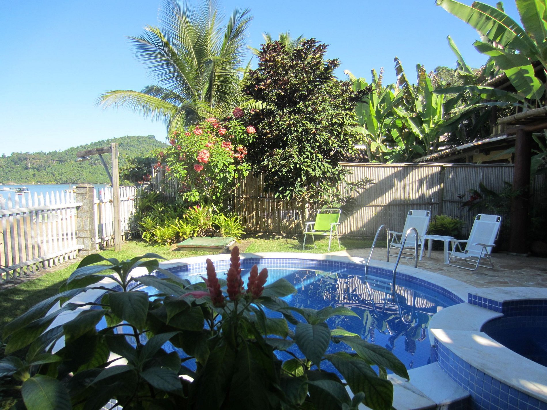 A casa é muito bonita e de bom gosto. Os cômodos são grandes, arejados e limpos. É possível apreciar a vista para o mar de muitos cômodos e da piscina. As suítes do andar de cima são bem espaçosas, com camas grandes, duas pias, espaço para mala, pendurar roupas etc. As suítes de baixo são menores, mas suficientemente boas para a estadia. Da sacada de cima conseguimos apreciar o mar e os macaquinhos da bananeira. A praia é linda, mas por ter muitos barcos, a prefeitura não recomenda banho. Não nadamos, mas aproveitamos muito o pier, caminhadas, os 2 restaurantes ao lado, por e nascer de sol. Outras pessoas banharam-se. A piscina é quentinha, gostosa. O lugar todo é calmo, 5-7min de carro para o centrinho histórico e pareceu seguro. Foi muito bom.